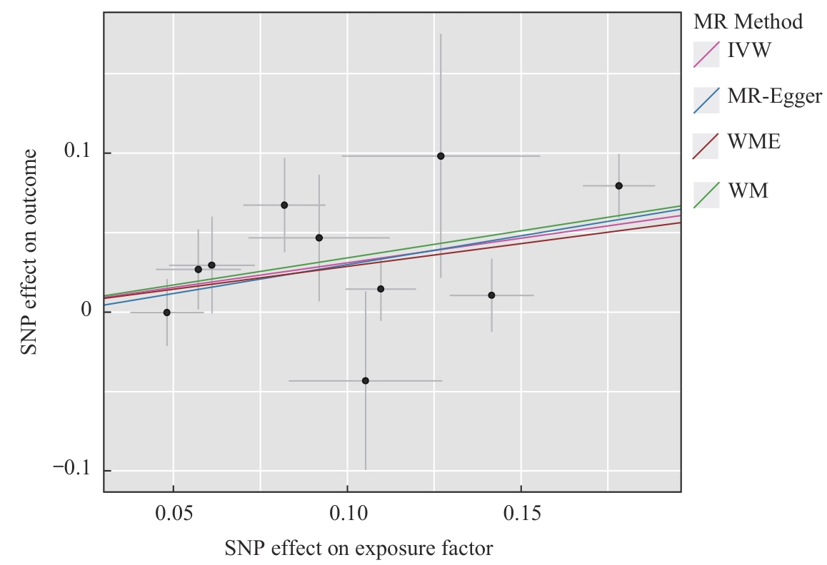 | 图2 10个SNP与PE、结直肠腺癌关联的汇总数据估计的散点图 Note: Each dot in this graph represents an instrumental variable; the lines at each dot reflect the 95%CI. The x-axis represents the effect of each SNP on the exposure factor (PE), and the y-axis represents the effect on the outcome (colorectal adenocarcinoma). The colored lines represent the Mendelian randomization fit (MR Fit). |