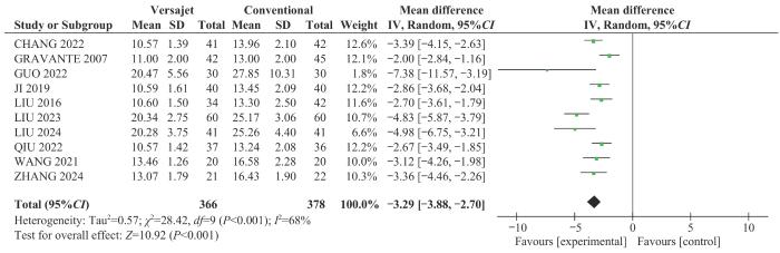 ① 研究对象为需要清创的烧伤患者,伴有不同程度的创面感染,无其他损伤或基础疾病,不限种族、性别和年龄。② 使用水动力清创系统作为清创工具,使用常规手术器械作为清创工具。③ 结果指标包括创面愈合时间、每1%总体表面积(total body surface area,TBSA)创面的清创时间、术后7 d植皮存活率、二次清创率、术后3 d创面分泌物细菌培养阳性率、住院时间、术后感染发生率。④ 研究类型为RCT。