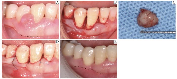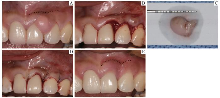 Note: A. Epulis between the left maxillary central and lateral incisors. B. Excision of the epulis. C. The size of the epulis. D. The wound was sutured with CAF technique. E. Six months post-surgery. The dotted line marks the position of the muco-gingival junction.