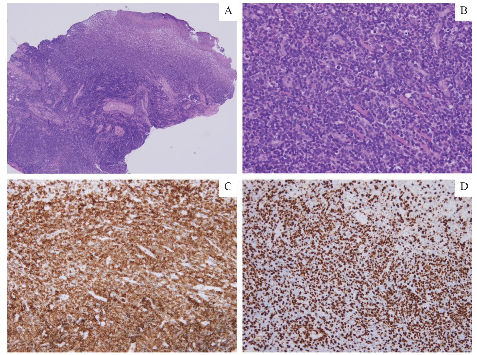Fig 3 Histopathological examination Note: A. Ulceration of the right tongue mucosa with diffuse infiltration of lymphoid cells (H-E staining, ×40). B. Atypical lymphoid cells exhibit hyperchromatic nuclei and a high nuclear-to-cytoplasmic ratio (H-E staining, ×200). C. CD3 positive (+) staining (×200). D. Ki-67 positivity in 60%‒70% of cells (×200).