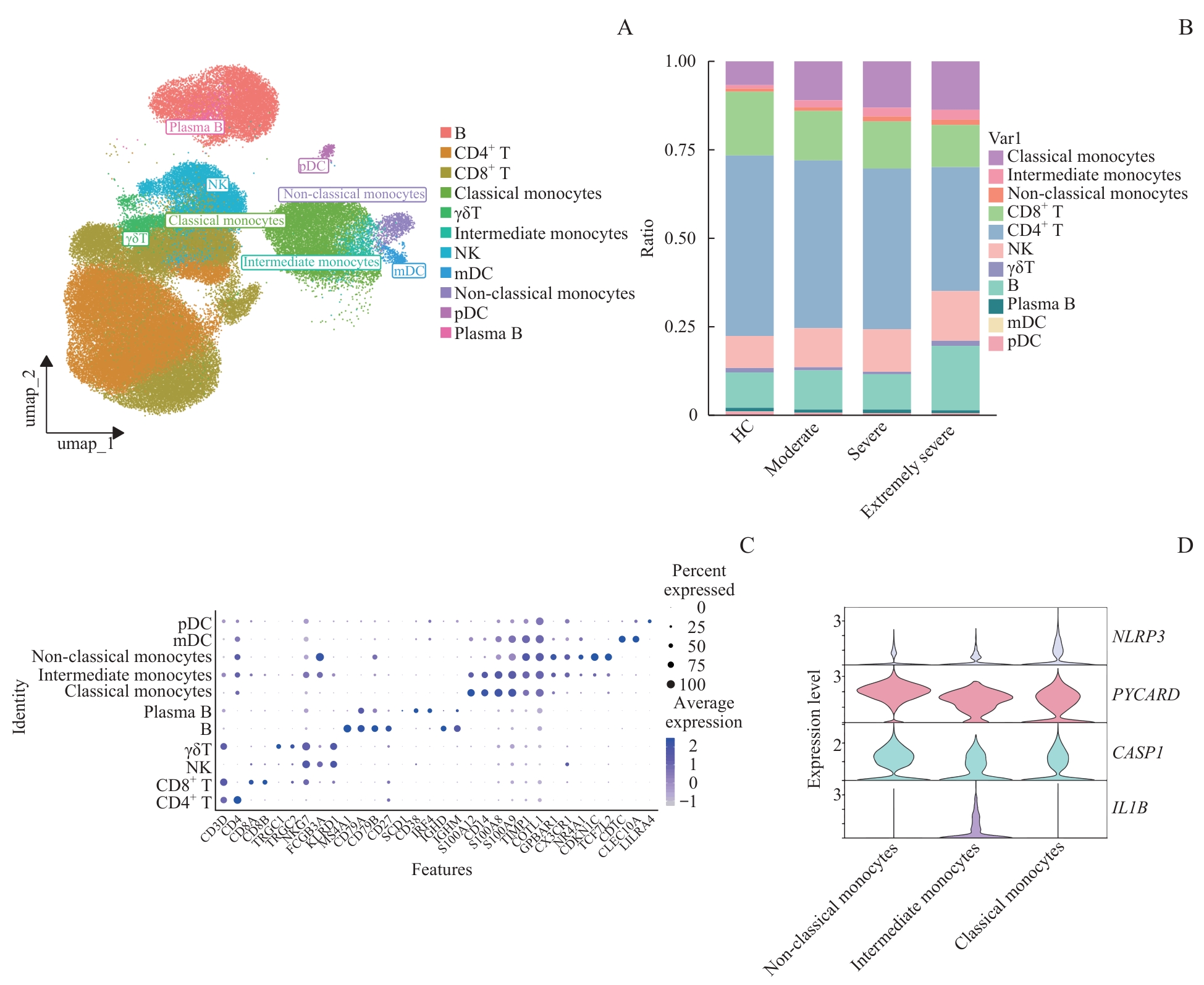 | 图4 OMSI患者与健康对照者PBMCs单细胞转录组二级聚类 Note: A. UMAP plot showing clustering into 11 immune cell subtypes. B. Bar plot showing the ratio of each cell subtype in 4 groups. C. Dotplot showing cluster-defining gene expression across the 11 immune cell subtypes. D. Expression of NLRP3, CASP1, PYCARD and IL1B in monocyte subtypes. B—B cell; mDC—myeloid dendritic cell; pDC—plasmacytoid dendritic cell. |