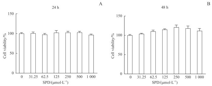 将对数生长期的RAW264.7细胞按2×105个/孔接种至96孔板中,采用不同浓度的SPD(0、31.25、62.5、125、250、500、1 000 μmol/L)处理细胞,分别在96孔板中孵育24 h和48 h。处理完成后,每孔加入10 μL CCK-8溶液,继续孵育4 h,随后使用酶标仪在450 nm波长处测定吸光度。