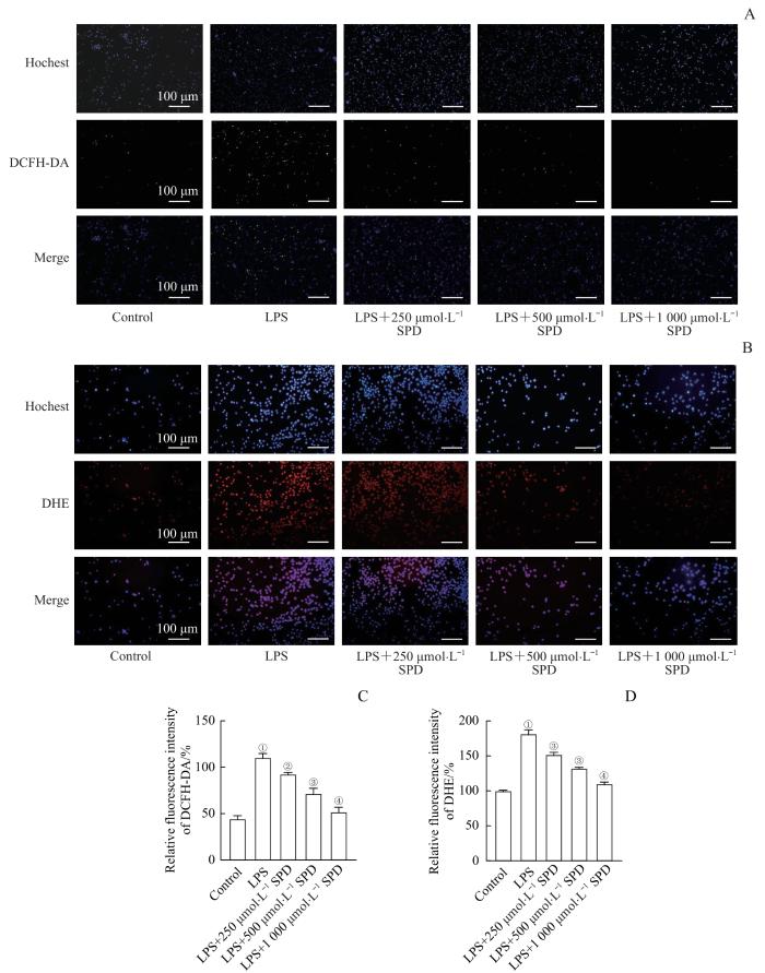 将RAW264.7细胞接种于共聚焦培养皿中,接种密度为5×104个/孔。待细胞贴壁后,分别加入100 ng/mL的LPS和不同浓度(250、500、1 000 μmol/L)的SPD,培养24 h。然后使用DCFH-DA和DHE染色液分别测定细胞内的活性氧(reactive oxygen species,ROS)水平。