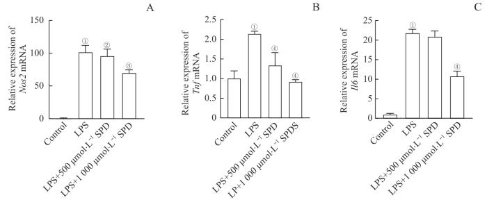 将RAW264.7细胞接种于6孔板中,接种密度为4×105个/孔。待细胞贴壁后,分别加入100 ng/mL的LPS和不同浓度(500、1 000 μmol/L)的SPD,培养24 h。用同样的方式检测RAW264.7细胞炎症相关因子Il6、Tnf、一氧化氮合酶2(nitric oxide synthase 2,Nos2)的表达。