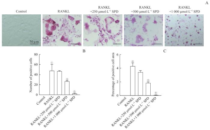 我们通过体外实验研究SPD对RANKL诱导的小鼠原代BMM向破骨细胞分化的影响。如图4所示,原代BMM经RANKL诱导后,形成大量TRAP阳性的多核破骨细胞,而SPD处理后,TRAP阳性破骨细胞的数量和面积减少,呈一定剂量依赖性;尤其是500 μmol/L和1 000μmol/L的SPD显著抑制破骨细胞的生成。可见,SPD可以抑制RANKL诱导的破骨细胞分化。