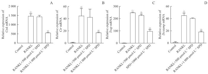 破骨细胞相关基因的表达代表了BMM向破骨细胞分化的能力,RANKL刺激引起的骨吸收和破骨细胞形成通常伴随着这些特异性标志基因的上调。为了研究SPD的抗破骨细胞分化的作用,我们通过RT-qPCR检测Ctsk、Ctr、Trap、Dcstamp基因的表达情况,结果(图5)显示:与对照组相比,破骨诱导组Ctsk、Ctr、Trap、Dcstamp基因的表达显著增加;而与破骨诱导组相比,1 000 μmol/L SPD处理组这4个基因的mRNA表达显著降低。