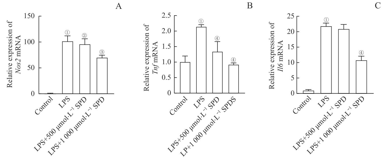 | 图3 SPD对LPS激活的巨噬细胞促炎基因表达的影响 Note: A‒C. mRNA levels of Nos2 (A), Tnf (B), and Il6 (C). ①P<0.001, compared with the control group; ②P=0.031, ③P=0.001, ④P<0.001, compared with the LPS group. |
