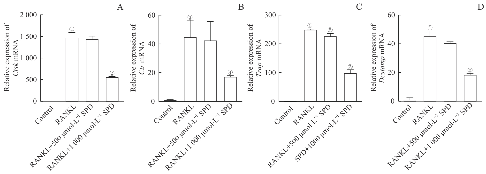 | 图5 SPD对RANKL刺激24 h后BMM表达破骨细胞相关基因的影响 Note: A‒D. mRNA levels of Ctsk (A), Ctr (B), Trap (C), and Dcstamp (D). ①P<0.001, ③P=0.001, compared with the control group; ②P<0.001, ④P=0.020, ⑤P=0.018, compared with the RANKL group. |