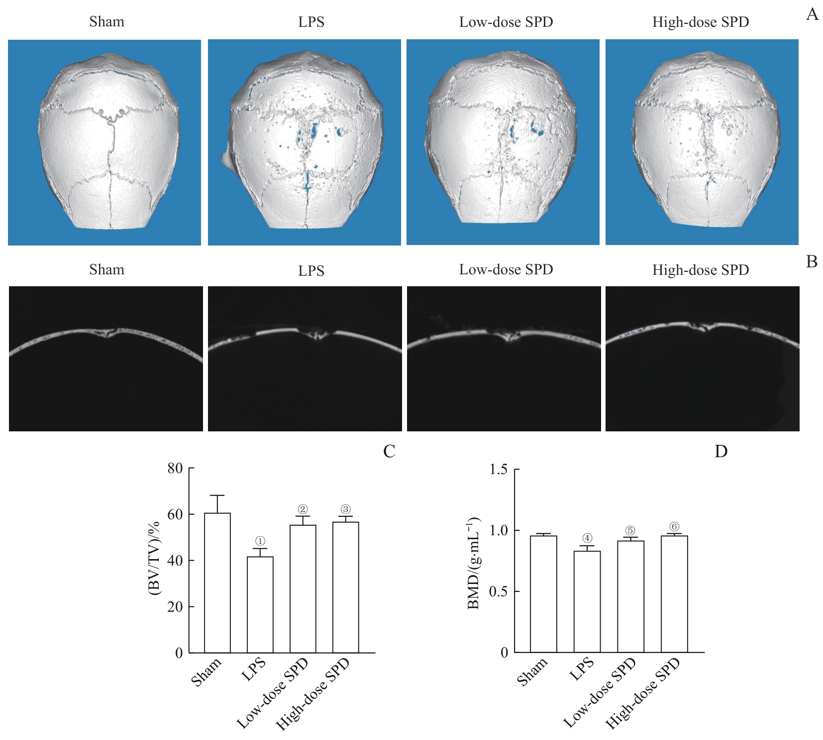 | 图6 Micro-CT分析SPD对小鼠颅骨骨溶解的治疗效果 Note: A. 3D reconstruction of mouse cranial bone. B. Sagittal CT images of mouse cranial bone. C. Statistical analysis of BV/TV. D. Statistical analysis of BMD. ①P=0.003, ④P<0.001, compared with the sham group; ②P=0.020, ③P=0.012, ⑤P=0.005, ⑥P<0.001, compared with the LPS group. |