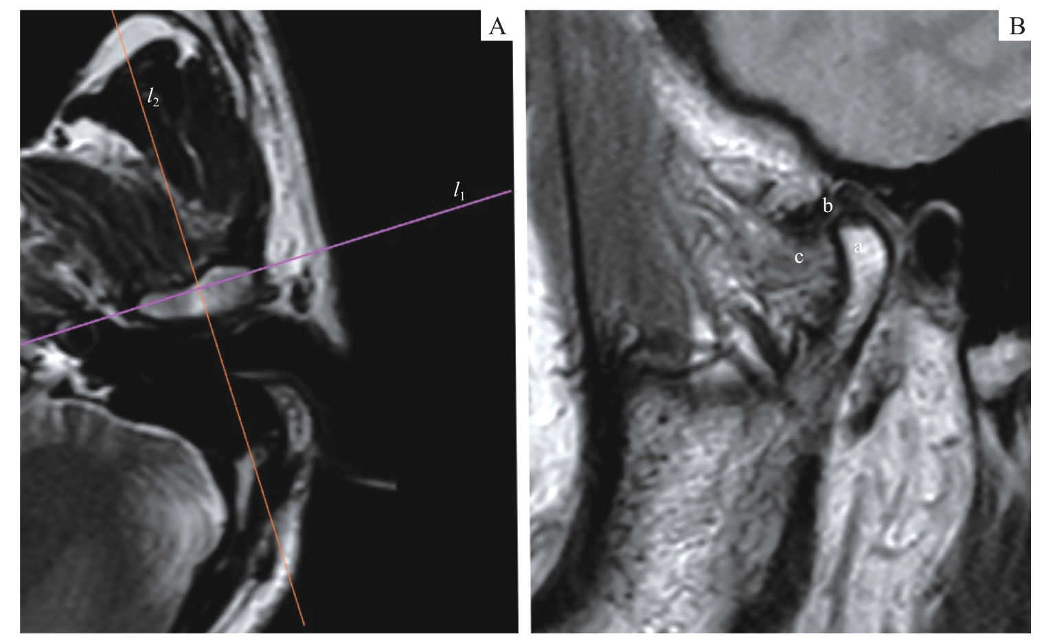 | 图1 MRI阅片时的定位平面 Note: PDWI images. A. Axial plane. l1—the transverse axis of the condyle (the line connecting the internal and the external poles of the condyle); l2—the positioning plane perpendicular to the condylar transverse axis. B. Oblique sagittal plane. a—condyle; b—articular disc; c—lateral pterygoid muscle. |
