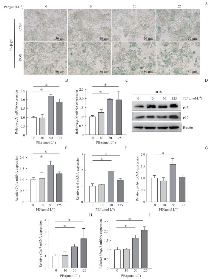 Note: A. Representative images of SA-β-gal staining in RAW264.7 cells treated with different concentrations of PE (0, 10, 50 and 125 μmol·L-1) in the presence or absence of DOX (0.5 μmol·L-1), bar=50 μm. B/C. Quantitative real-time PCR analysis of expression of senescence markers p21 (B) and p16 (C) in RAW264.7 cells treated with different concentrations of PE (0, 10, 50 and 125 μmol·L-1) in the presence of DOX. D. Western blotting analysis of senescence markers. E‒I. Quantitative real-time PCR analysis of expression of senescence-associated secretory phenotype (SASP) factors Tnf-α (E), Il-6 (F), Il-1β (G), Cxcl1 (H) and Mmp13 (I). ①P<0.001, ②P=0.001, ③P=0.021, ④P=0.005, ⑤P=0.027, ⑥P=0.023, ⑦P=0.031, ⑧P=0.019, ⑨P=0.009, ⑩P=0.045, ⑪P=0.008, ⑫P=0.002. DOX—doxorubicin.