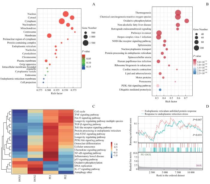 Note: The DOX group was treated with 0.5 μmol·L-1 DOX, while the PE group was treated with 50 μmol·L-1 PE in combination with DOX. A. GO enrichment analysis of cellular component categories, presented as an enrichment factor plot [(PE+DOX) vs DOX]. B. KEGG pathway enrichment analysis displayed as an enrichment factor plot [(PE+DOX) vs DOX]. C. Heatmap of GSVA [(PE+DOX) vs DOX]. D. GSEA of endoplasmic reticulum unfolded protein response and response to endoplasmic reticulum stress [(PE+DOX) vs DOX].