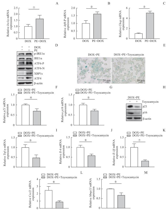 Note:A‒C. Quantitative real-time PCR analysis of Ire1α (A), Atf6 (B) and Chop (C) mRNA expression in RAW264.7 cells treated with DOX and PE (50 μmol·L-1). D. Western blotting analysis of endoplasmic reticulum stress-related proteins, including p-IRE1α, IRE1α, ATF6-P, ATF6-N, XBP1s and ATF4. E. SA-β-gal staining of RAW264.7 cells treated with Toyocamycin, DOX and PE. F/G. Quantitative real-time PCR analysis of senescence marker mRNA expression, including p21 (F) and p16 (G). H. Western blotting analysis of proteins including p21 and p16. I‒M. Quantitative real-time PCR analysis of SASP mRNA expression, including Tnf-α (I), Il-6 (J), Il-1β (K), Cxcl1 (L) and Mmp13 (M). ①P=0.033, ②P=0.009, ③P<0.001, ④P=0.014, ⑤P=0.012, ⑥P=0.005, ⑦P=0.003, ⑧P=0.008, ⑨P=0.010.
