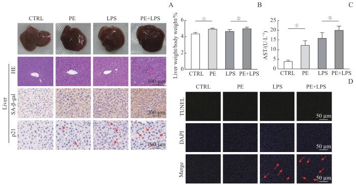 Note: Mice were divided into the PE group, lipopolysaccharide (LPS) group, and PE+LPS group by intraperitoneal injection of PE, LPS, and PE combined with LPS, respectively, with an additional blank control (CTRL) group. A. General morphology, HE staining and immunohistochemistry of the liver from the four groups of mice. HE staining, bar=100 μm; SA-β-gal immunohistochemistry, bar=200 μm; p21 immunohistochemistry, bar=100 μm. Red arrows indicate p21-positive cells. B. Percentages of liver weight. C. Plasma AST in the indicated mice. D. TUNEL staining of liver, bar=50 μm. Red arrows indicate TUNEL-positive cells. ①P<0.001, ②P=0.041, ③P=0.037.