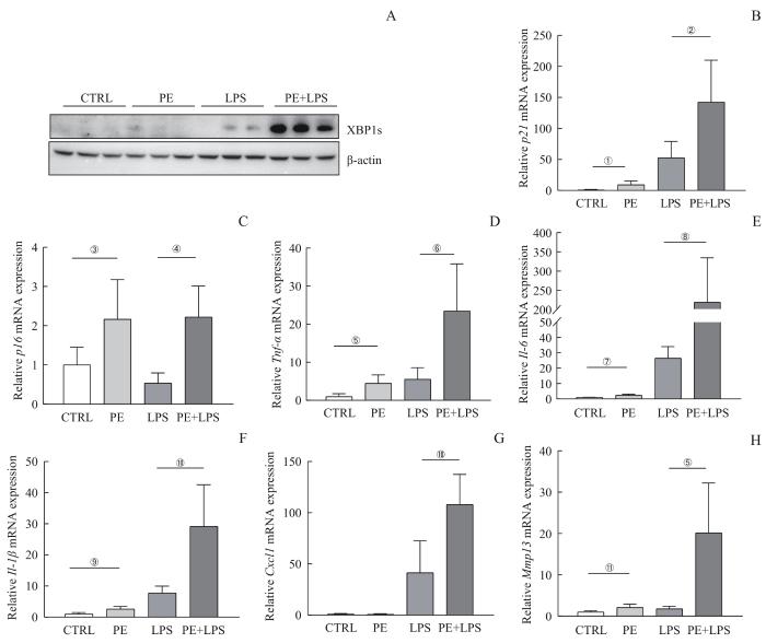 Note: A. Western blotting analysis of liver lysates from the control (CTRL), PE, LPS, and PE+LPS groups. B‒H. Quantitative real-time PCR analysis of senescence markers and SASP mRNA expression in mouse liver, including p21 (B), p16 (C), Tnf-α (D), Il-6 (E), Il-1β (F), Cxcl1 (G)