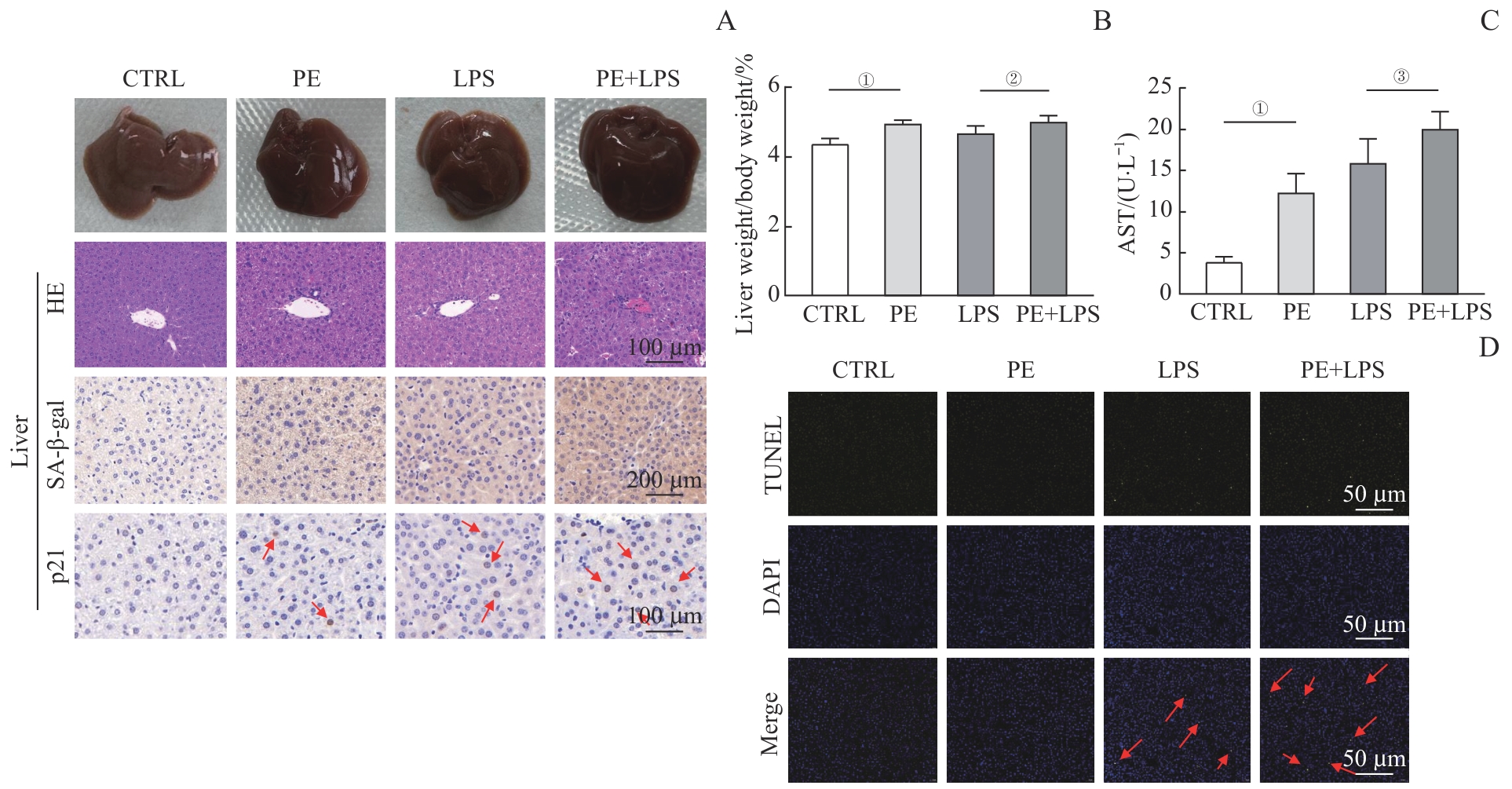 | 图4 PE加剧脂多糖诱导的肝损伤 Note: Mice were divided into the PE group, lipopolysaccharide (LPS) group, and PE+LPS group by intraperitoneal injection of PE, LPS, and PE combined with LPS, respectively, with an additional blank control (CTRL) group. A. General morphology, HE staining and immunohistochemistry of the liver from the four groups of mice. HE staining, bar=100 μm; SA-β-gal immunohistochemistry, bar=200 μm; p21 immunohistochemistry, bar=100 μm. Red arrows indicate p21-positive cells. B. Percentages of liver weight. C. Plasma AST in the indicated mice. D. TUNEL staining of liver, bar=50 μm. Red arrows indicate TUNEL-positive cells. ①P<0.001, ②P=0.041, ③P=0.037. |