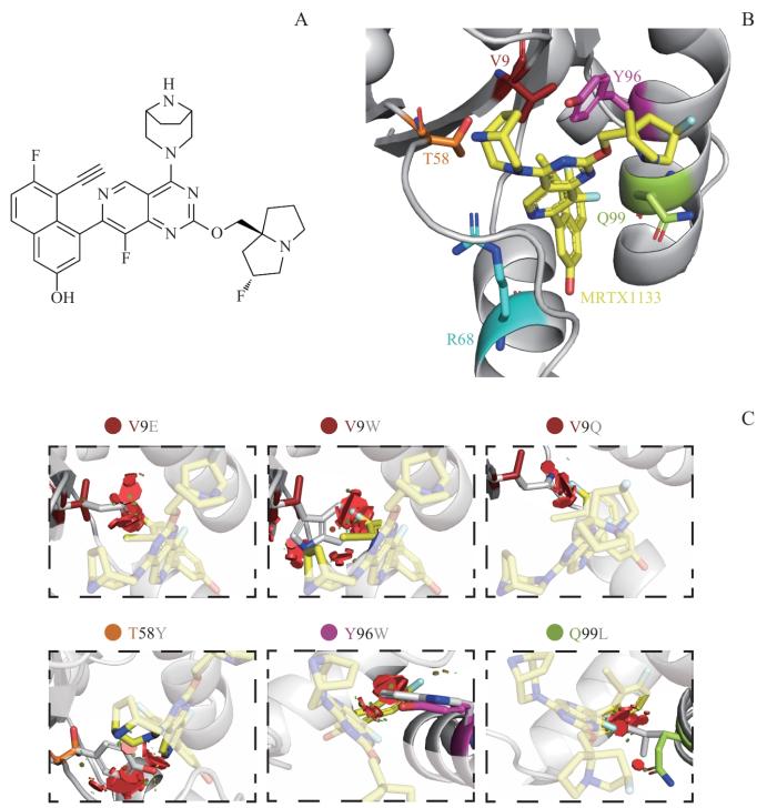 Note: A. Chemical structure of MRTX1133. B. The MRTX1133 binding pocket (PDB ID: 7RPZ). C. Six secondary mutations, including V9E, V9W, V9Q, T58Y, Y96W and Q99L, cause significant steric hindrance or block the formation of interactions between MRTX1133 and KRAS. Red areas stand for steric clashes.