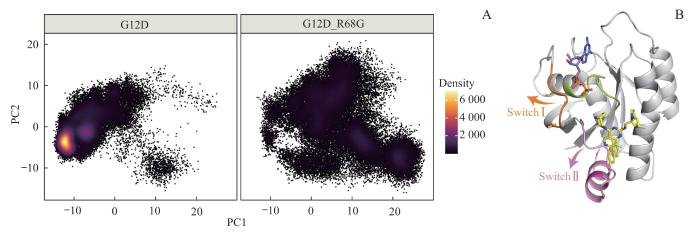 为了描绘2个体系全局的构象转变,对整个运动过程的轨迹进行PCA。根据每帧构象在前2个主成分(PC1和PC2)上的投影,绘制G12D和G12D_R68G体系的点密度图(图3A)。结果显示,与G12D体系相比,G12D_R68G体系具有明显较高的PC1值[(7.69±8.46) vs (-7.69±5.52),P<0.001,图3A]。将运动轨迹按照PC1值排序,得到KRAS蛋白随着PC1值增加而产生的构象变化(图3B),即Switch Ⅰ区域和Switch Ⅱ区域的柔性部分均远离P-loop区域而向外运动。综上所述,KRAS R68G继发突变破坏了KRASG12D的运动模式,促进KRAS向更加开放的构象转变。