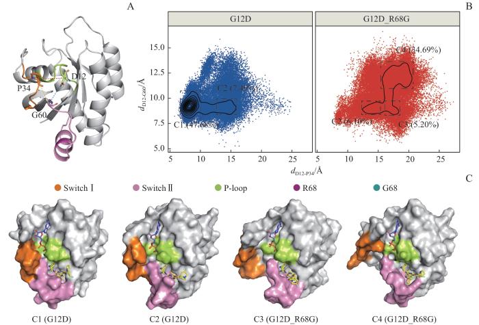 为了进一步探索KRAS R68G继发突变对KRAS Switch Ⅰ和Switch Ⅱ区域运动的影响,选择3个特征向量用于描绘Switch Ⅰ、SwitchⅡ和P-loop 3个区域之间的关系(图4A)。KRAS中第12位天冬氨酸和第34位脯氨酸α碳原子之间的距离(dD12-P34)代表P-loop和Switch Ⅰ区域之间的距离[24-25],其一定程度上反映GDP结合口袋的大小。KRAS中第12位天冬氨酸和第60位甘氨酸α碳原子之间的距离(dD12-G60)代表P-loop和Switch Ⅱ区域柔性部分之间的距离[24-25],其一定程度上反映MRTX1133结合口袋的大小。KRAS中第34位脯氨酸和第60位甘氨酸α碳原子之间的距离(dP34-G60)代表Switch Ⅰ和Switch Ⅱ区域之间的距离。将两体系的全部构象根据dD12-P34和dD12-G60特征向量进行投影,绘制构象景观图(图4B)。图中点密度较高的区域为具有相似dD12-P34和dD12-G60聚集的区域,依次将这些区域分类为C1(7.0 Å<dD12-P34<10.0 Å,8.0 Å<dD12-G60<10.5 Å)、C2(12.5 Å<dD12-P34<15.0 Å,8.5 Å<dD12-G60<9.5 Å)、C3(16.0 Å<dD12-P34<18.5 Å,8.5 Å<dD12-G60<9.5 Å)和C4(15.5 Å<dD12-P34<20.5 Å,10.5 Å<dD12-G60<13.5 Å)。在G12D体系中,C1占47.68%(为G12D体系的主要构象),C2占7.49%,而C3和C4在G12D体系中几乎没有。在G12D_R68G体系中,C2占6.10%,C3占5.20%,C4占34.69%(为G12D_R68G体系的主要构象),而C1在G12D_R68G体系中占比很少。该结果表明R68G继发突变显著影响了KRAS Switch Ⅰ和Switch Ⅱ区域的运动。C1至C4的代表性构象如图4C所示。在C1的代表性构象中,Switch Ⅰ、Switch Ⅱ和P-loop区域之间的距离较近,MRTX1133和GDP的结合口袋均处于关闭状态。在C2和C3的代表性构象中,MRTX1133的结合口袋均处于关闭状态,而GDP结合口袋在C3中比在C2中有更大的开放程度,且开始出现Switch Ⅰ与Switch Ⅱ分离的趋势。在C4的代表性构象中,MRTX1133的结合口袋处于开放状态,Switch Ⅰ向外运动程度更高,GDP结合口袋开放更大,出现Switch Ⅰ与Switch Ⅱ区域的分离。