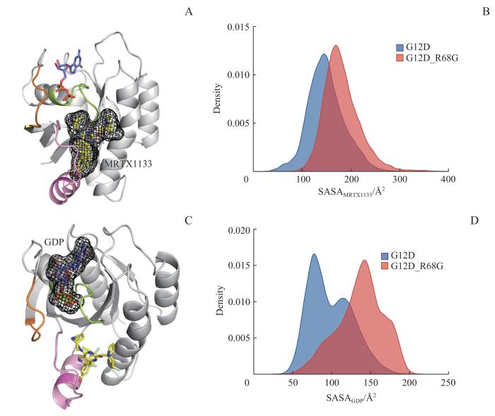 Note: A. Diagram of the SASA of MRTX1133. B. Density plots of SASA of MRTX1133 in KRASG12D and KRASG12D/R68G systems. C. Diagram of the SASA of GDP. D. Density plots of SASA of GDP in KRASG12D and KRASG12D/R68G systems.