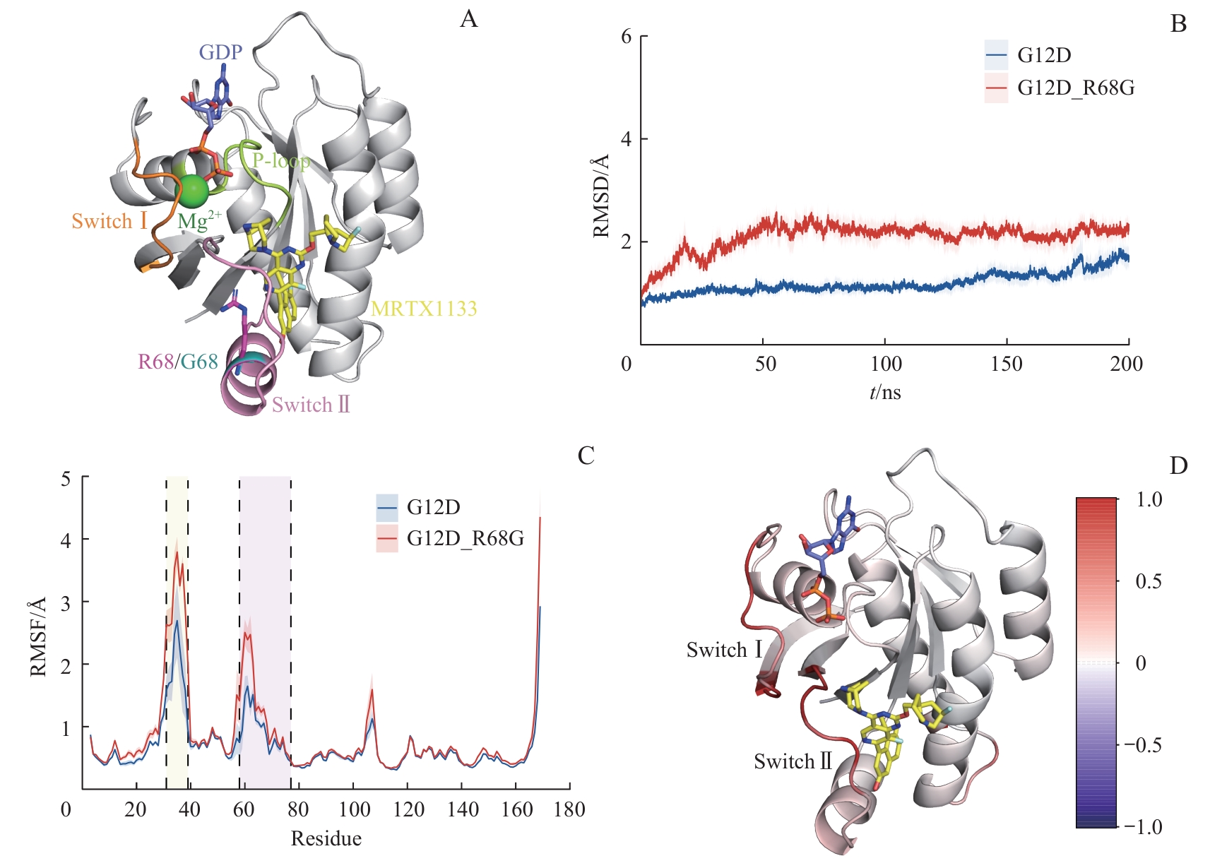 | 图2 KRASG12D 和KRASG12D/R68G 的构象动力学 Note: A. The initial structures of the KRASG12D and KRASG12D/R68G systems. B. RMSDs of Cα atoms in KRASG12D and KRASG12D/R68G systems. C. RMSFs of each residue in KRASG12D and KRASG12D/R68G systems. Yellow region stands for the Switch Ⅰ region, while pink region represents the Switch Ⅱ region. D. The distribution of delta RMSF values of the KRASG12D/R68G system relative to the KRASG12D system. Red regions represent higher RMSF values, whereas blue regions stand for lower RMSF values. |