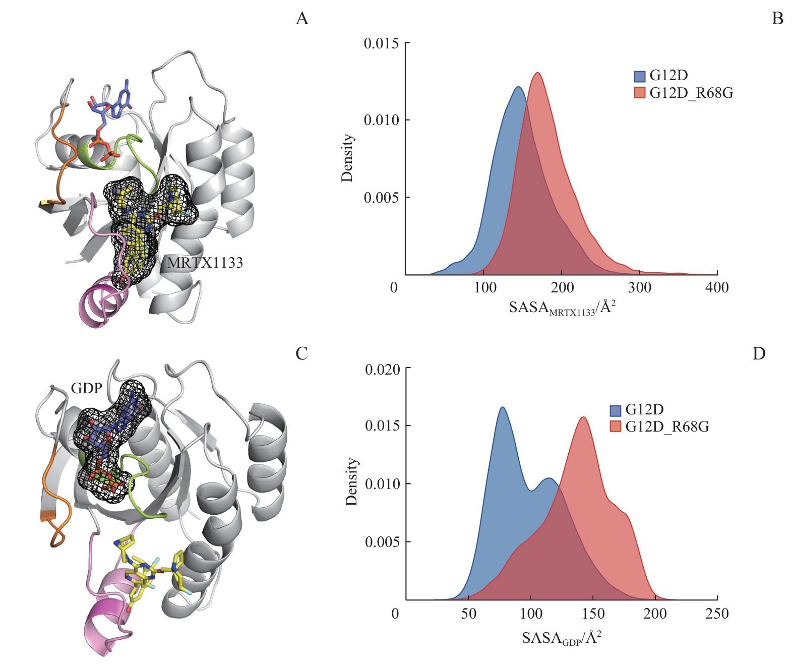 | 图5 MRTX1133和GDP的SASA Note: A. Diagram of the SASA of MRTX1133. B. Density plots of SASA of MRTX1133 in KRASG12D and KRASG12D/R68G systems. C. Diagram of the SASA of GDP. D. Density plots of SASA of GDP in KRASG12D and KRASG12D/R68G systems. |