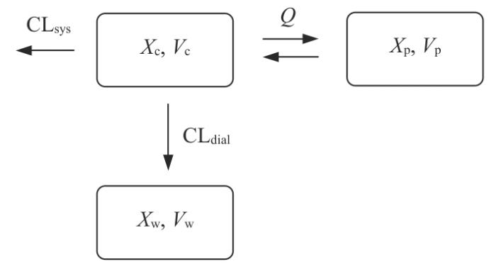 Schematic diagram of a two-compartment pharmacokinetic model with a dialysate waste chamber