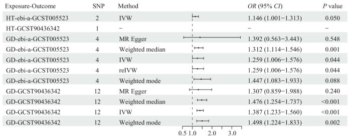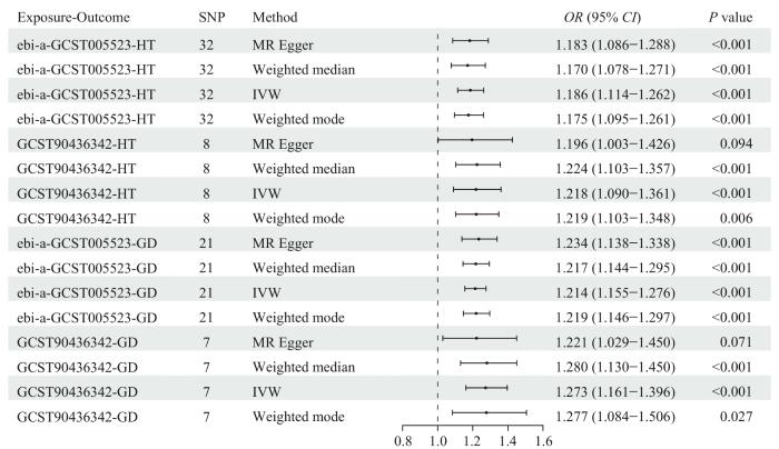 Objective ·To investigate the bidirectional causal relationships between celiac disease (CeD) and Hashimoto thyroiditis (HT) as well as Graves disease (GD), using a two-sample Mendelian randomization (MR) approach. Methods ·Single nucleotide polymorphisms (SNPs) related to CeD, HT and GD were extracted from publicly available Genome-Wide Association Studies (GWAS) databases and used as instrumental variables. The inverse-variance weighted (IVW) method served as the primary analytical approach, supplemented by MR-Egger, weighted median (WME) and weighted mode (WMO) methods, to evaluate the causal associations between CeD and both HT and GD. Replication analyses using alternative GWAS datasets were conducted to validate the robustness of the results. Heterogeneity was assessed using Cochran's Q test, and pleiotropy was evaluated via MR-Egger intercept test. Leave-one-out analyses were performed to assess the impact of individual SNPs on the results. Results ·The IVW analysis results indicated that genetically predicted CeD significantly increased the risk of HT [discovery group: OR=1.186 (95%CI 1.114‒1.262), P<0.001; replication group: OR=1.218 (95%CI 1.090‒1.361), P<0.001] and GD [discovery group: OR=1.214 (95%CI 1.155‒1.276), P<0.001; replication group: OR=1.273 (95%CI 1.161‒1.396), P<0.001]. However, reverse MR analyses did not provide evidence for a causal relationship between HT and CeD, while genetically predicted GD significantly increased the risk of CeD [discovery group: OR=1.259 (95%CI 1.006‒1.576), P=0.044; replication group: OR=1.387 (95%CI 1.233‒1.560), P<0.001]. Sensitivity analyses suggested that the results were not influenced by horizontal pleiotropy. Conclusion ·CeD may be causally associated with a higher risk of HT and GD, while GD may increase the risk of developing CeD. HT does not appear to have an impact on CeD.