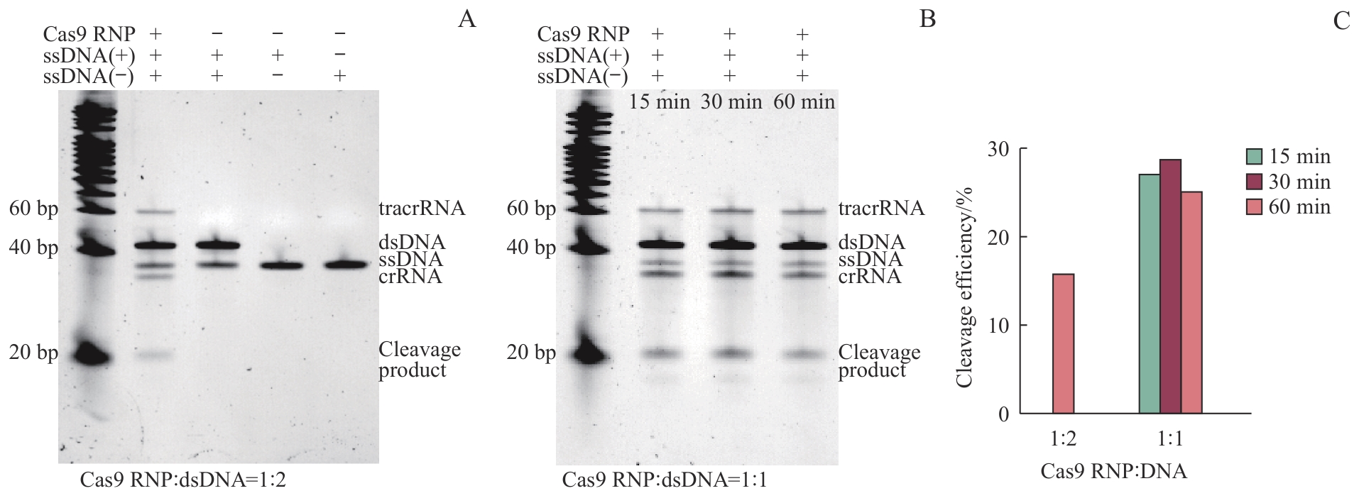 | 图3 Cas9 RNP切割体系优化 Note: A. Verification of cleavage products using the Cas9 RNP cleavage system (Cas9 RNP:dsDNA=1:2) at 20 ℃ for 60 min. B. Cleavage products verification of Cas9 RNP cleavage system (Cas9 RNP:dsDNA=1:1) with different cleavage time at 20 ℃. C. Cleavage efficiencies of Cas9 RNP under different ratios and different cleavage time. |