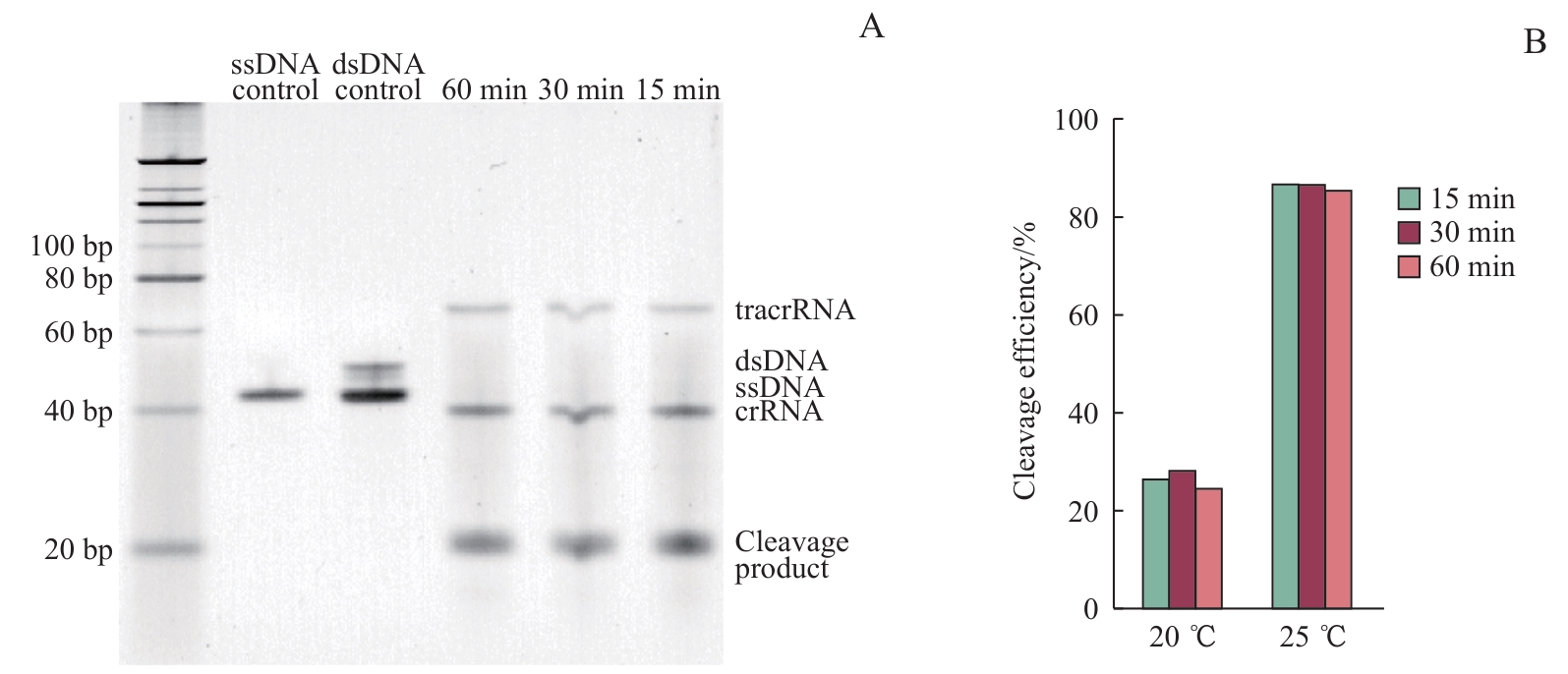 | 图4 Cas9 RNP合成温度筛选 Note: A. Cleavage products of Cas9 RNP synthesized at 25 ℃, with different cleavage incubation times. B. Cleavage efficiencies of Cas9 RNP synthesized at 20 ℃ or 25 ℃, under different cleavage incubation times. |