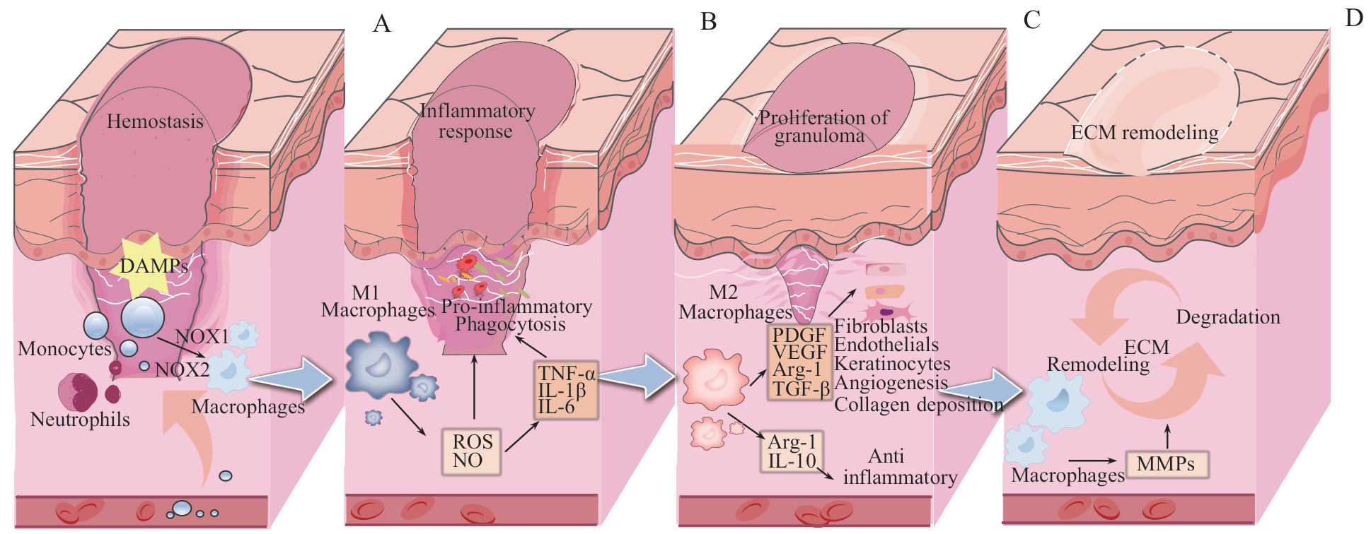| 图1 正常创面愈合过程中巨噬细胞的作用机制 Note: A. Hemostasis period. B. Inflammatory response period. C. Granulation tissue proliferation period. D. ECM remodeling period. DAMPs—damage-associated molecular patterns; NOX1—NADPH oxidase 1; NOX2—NADPH oxidase 2; VEGF—vascular endothelial growth factor; PDGF—platelet-derived growth factor. |